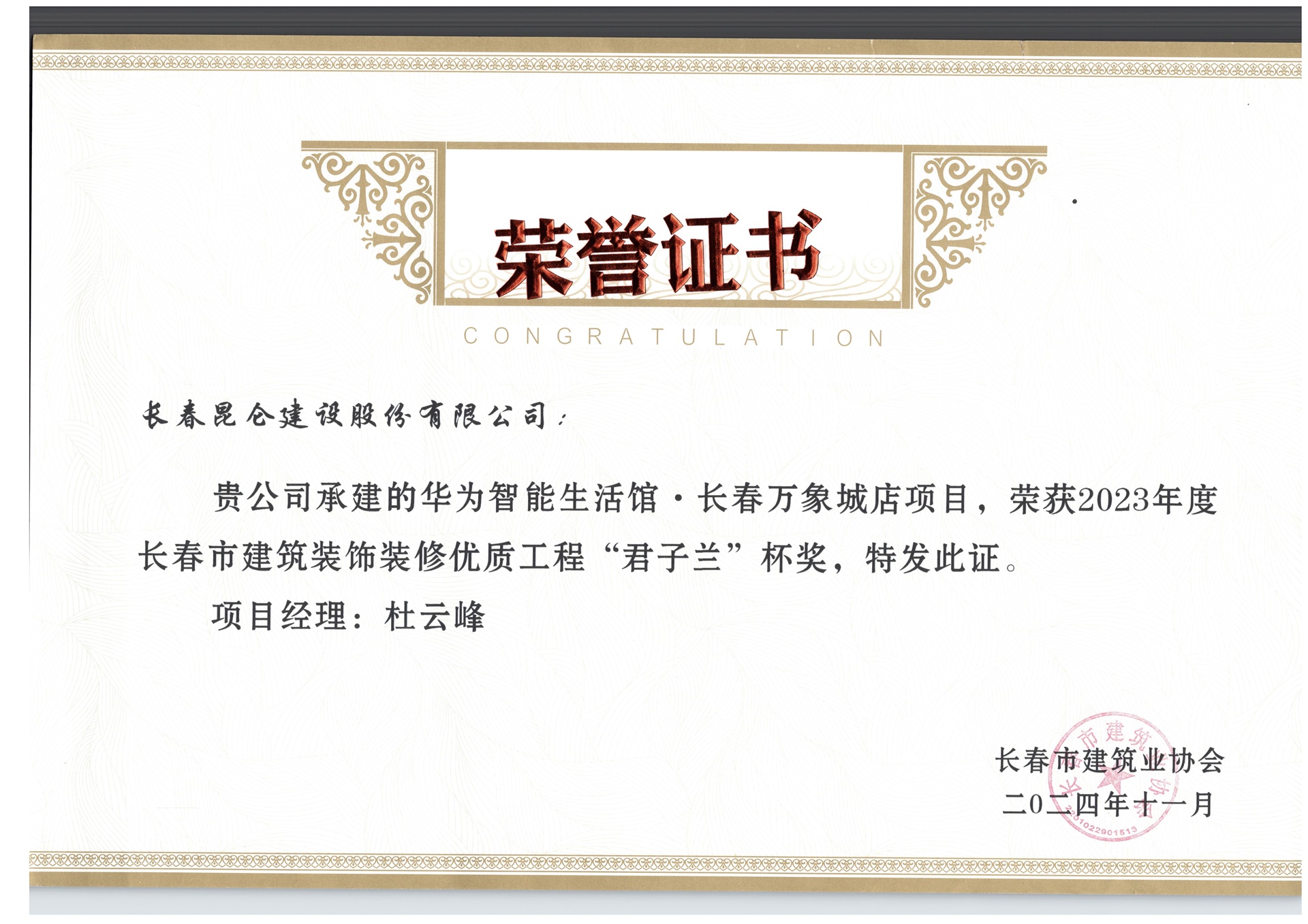 长春市建筑装饰装修优质工程“君子兰”奖