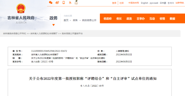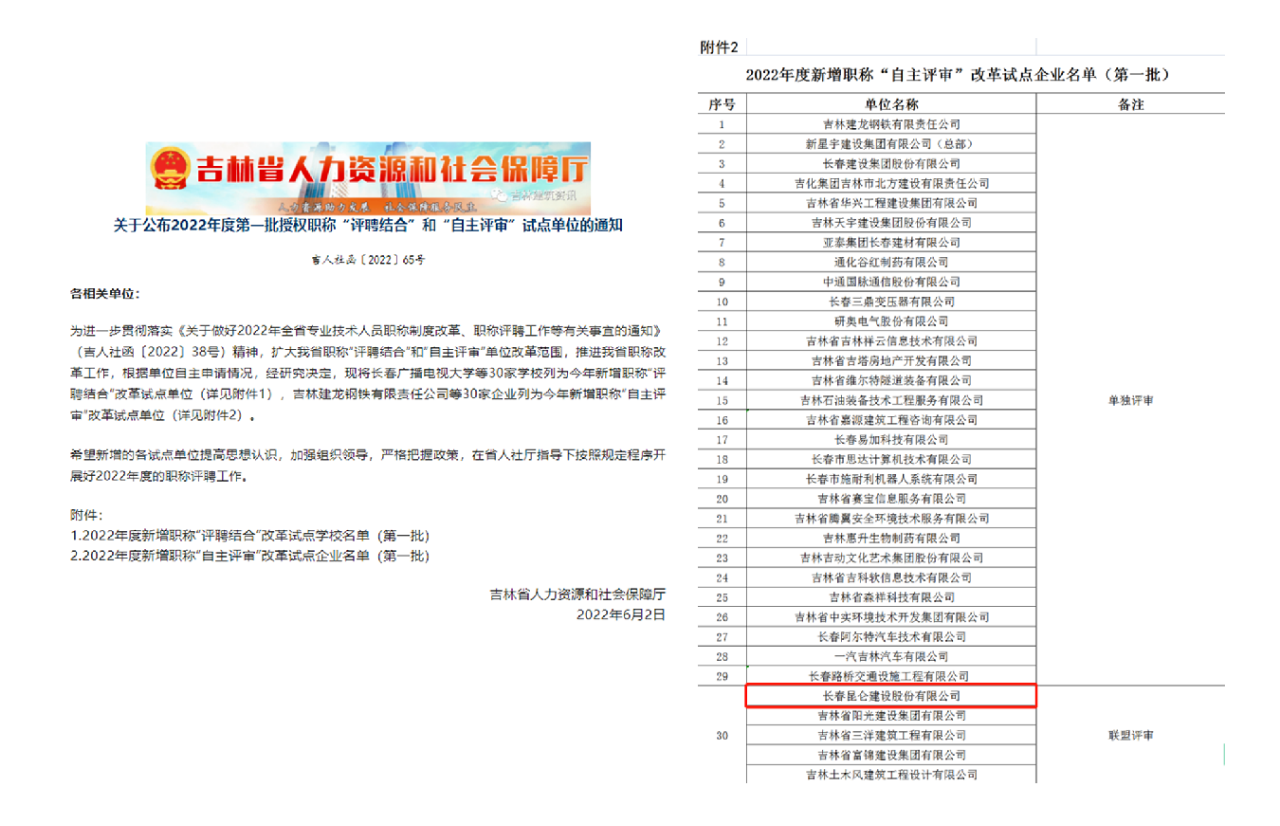 6月2日,吉林省人力资源和社会保障厅发布《关于公布2022年度第一批授权职称“评聘结合”和“自主评审”试点单位的通知》,在吉林省人民政府网站进行公示。昆仑建设入选,成为“吉林省2022年度第一批授权职称自主评审试点单位”。